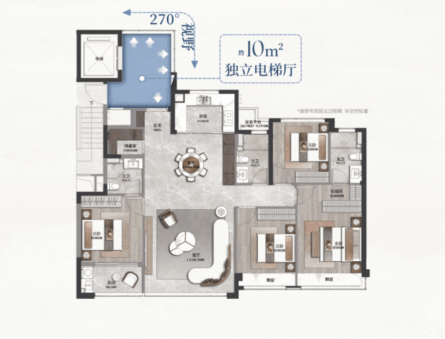 约32m豪华主卧套房,奢配衣帽间、双台盆卫浴享环幕全景视野。