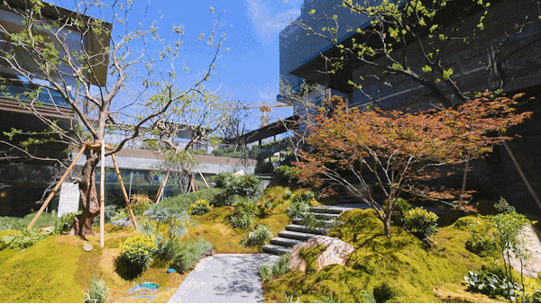 而最令人惊艳的,当属约6米地势差打造的下沉式山水庭院,山、石、水、林有序交织,犹如一幅“豁然开朗山水轴卷,每一步皆是景致,每一处皆有不同。