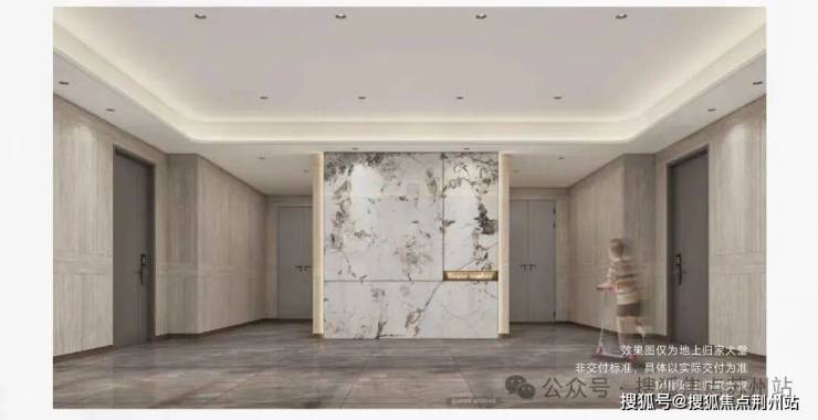 注重归家的仪式感,更重视心灵的归藏,奢装地上入户大堂,公区墙面地面均采用仿石材墙砖,大堂主背景采用仿石材岩板,搭配古铜色不锈钢踢脚线收口线,营造尊崇的入户体验,彰显奢宅生活主张。