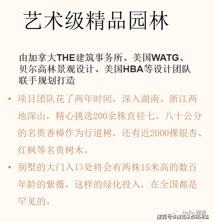 别墅生活重要的是对私密性的完美保护,因而如何选用和利用树木来保障私密、并提升小区生活环境的舒适性,对别墅居住者来说,是一个“十年树木、百年奠基”的长远规划。谈及这一规划,东郊一号团队花了两年时间,深入湖南、浙江两地深山,精心挑选200余株直径七、八十公分的名贵香樟作为行道树,还有近2000棵银杏、红枫等名贵树木。别墅的大门入口处将会有两株15米高的数百年龄的紫薇,这样的绿化投入,在全国都是罕见的。
