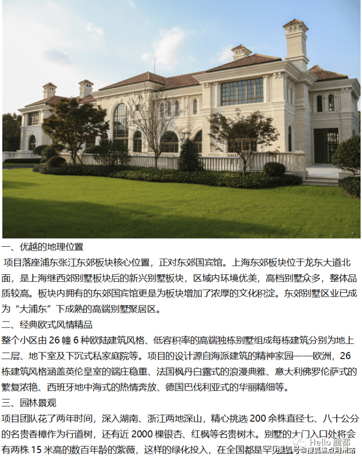 每栋建筑分别为 地上二层、地下室及下沉式私家庭院 等。设计源自海派建筑的精神家园——欧洲,十九栋建筑风格涵盖英伦皇室的端庄稳重、法国枫丹白露式的浪漫典雅、意大利佛罗伦萨式的繁复浓艳、西班牙地中海式的热情奔放、德国巴伐利亚式的华丽精细等。