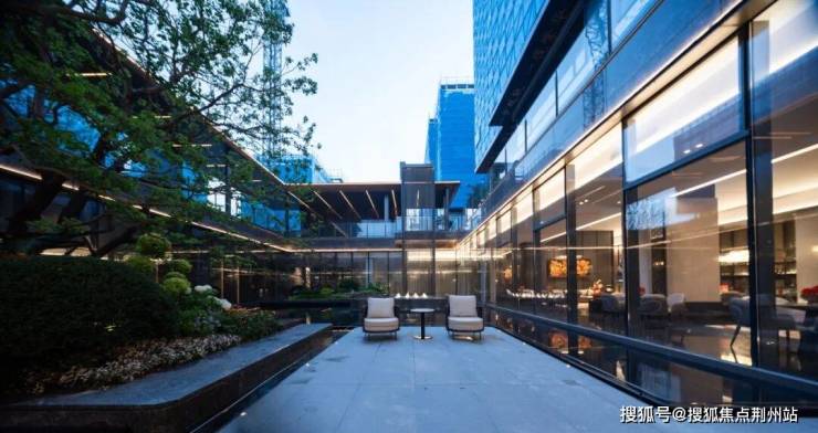 下沉式庭院巧妙布局了一片广阔的景观水域,象征着“将江水引入园中”,其周围环绕着清澈透明的玻璃幕墙和质感独特的黑耀灰大理石墙面,形成一幅宁静而庄严的景象。