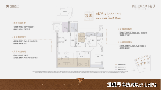 建面约105m²3房2厅2卫,为全明通透、三开间朝南格局,设有家政区周到处理居家收纳与生活动线,设计对居家收纳和生活杂务处理空间的周到考虑,采用客餐厅一体化的“方厅”布局,空间开阔流畅,可根据家庭成长阶段灵活调整,适应育儿、居家办公等多重场景。较适合从首套过渡、追求功能升级与品质改善的家庭,在有限面积内实现了居住功能与舒适感的显著提升。