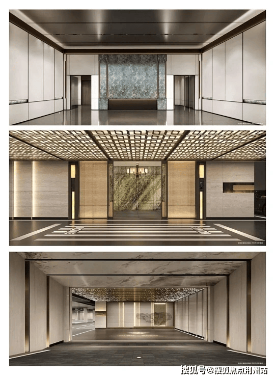 第二眼的惊艳,是穿过主入口所见到的水院!穿过大门,就来到了泓镜水院,这里有着山水小景,也有着层叠树木,硬质景观由石材、金属、园艺树种组成,雅致中透露着一丝静谧。比如,地面是采用斗纹式铺装的福鼎黑石材,墙面上使用了大面积的葡萄牙米黄石材进行饰面凿刻,暴露出石材原本的自然美感。水院西侧由东湖石斜切,模拟远山的型态;水院东侧紫铜饰面的艺术光影墙,模拟水波的纹路,与动态的水院交相呼应.....水院内还栽种了众多的名贵树种,这些树种都是设计师走遍了大半个中国,在苗圃中亲自寻到的。很多在园艺展中才能看到的园艺树种,在吴郡云熙府随处可见。示范区内还做到了一景一树,例如黑松、罗汉松、羽毛枫等,整个空间充斥着“贵气与厚重感”。