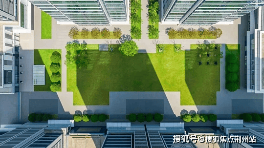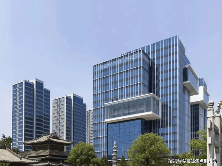 虽然拿地规划时间都很早,但从立面来看非常具有前瞻性。公建化的四面铝板外立面,十分现代,整体色调为“英蓝灰”和玻璃的“宝石蓝”,颜值非常高,与一旁古香古色的香积寺形成鲜明对比。