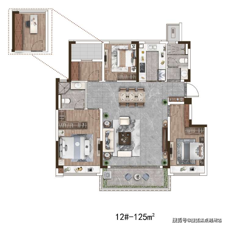 建面约125㎡的户型图,除了三房两厅两卫的经典布局,户型方正、超大面宽、动静分离等特点,都让它显得性价比满满。