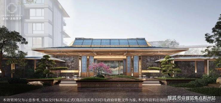 门头顶部是蓝色陶板+孔雀金奢石,大门两侧是奥映鸣翠同款铂金钻奢石,门前造型黑松与项目北侧1公里的4A景区皋亭山风景对望,拉开的身段看过去,满满丹青宋韵;
