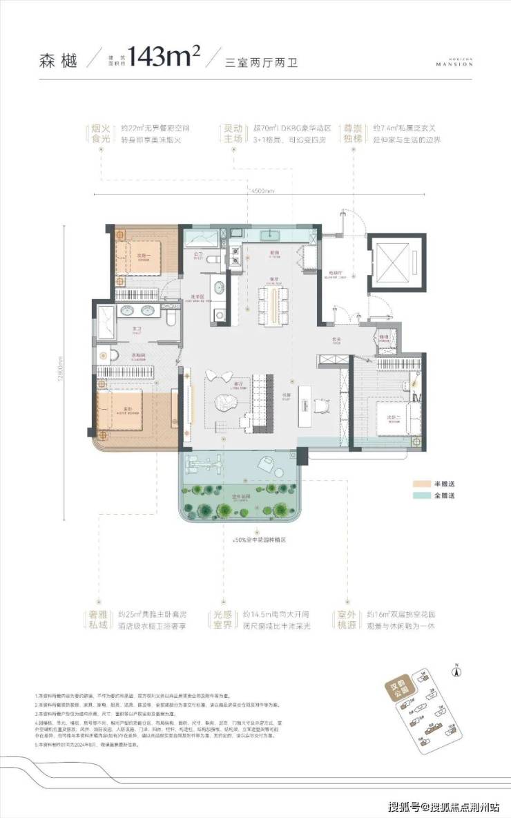 建面约143平 三房两卫:南北通透,3.5开间朝南,独立空中花园、独立电梯前室;三叶草格局,舒适性不错,可改四房。此外,该户型另一种结构是空中花园连接南向次卧和客厅的书房部分,居住体验会弱一些。