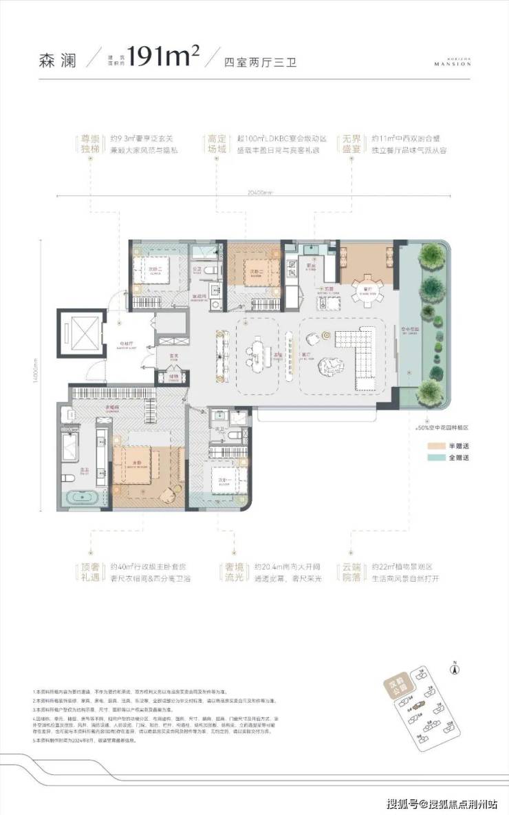 建面约191平 四房两厅三卫:仅分布了6号楼,纯板楼户型,带有独立空中花园为全赠送面积,还有大量半赠送空间,实际得房率超高;还可享独立电梯前室,南北通透,南向横厅,还能改成五房三卫。该户型相邻楼层另一种结构是空中花园在客厅南面,而东侧或西侧就没有空中花园了。