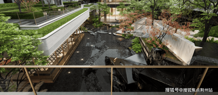 在社区大门背后,利用约5.6米高差,凿出高山叠瀑与曲径通幽、充满自然禅意的下沉庭院。