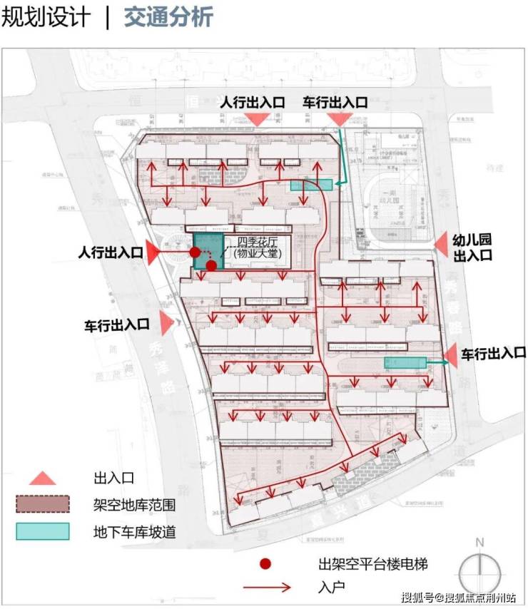 3个车行出入口朝向西、北、东侧,与架空平台边界融为一体,比传统地库出入口更气派。