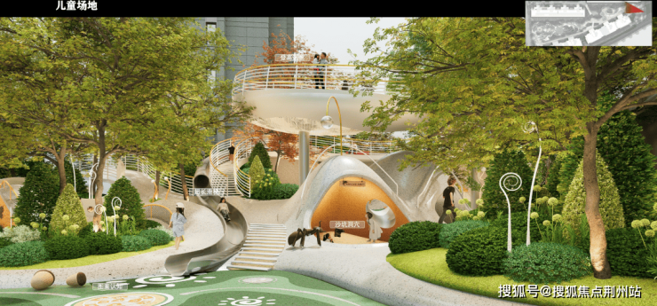 社区东南角借高差打造多维立体的童玩王国「海棠秘谷」,让孩子们在高低落差间释放天性。