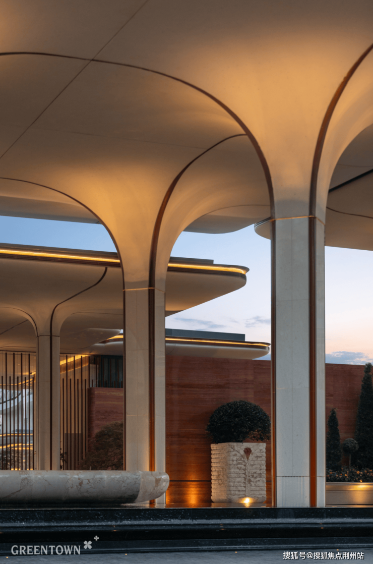 超2000㎡“玉映长安”艺术空间会所,延续了“玉树”造型勾勒出拱券与柱廊的韵律感。负一层会所开放式休憩区域顶部延续弧顶设计,自带纹理的米白色卡斯贝特石材呈现玉的温润质感。