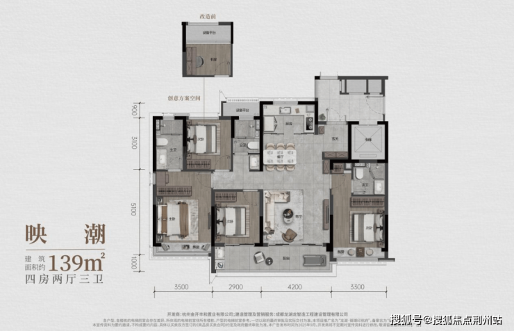 建面约139㎡的四房三卫户型,做到了四开间朝南,保证采光充足;更大的亮点在于三卫双套房设计,解决二胎或者三代同堂家庭早起抢卫生间的尴尬和隐私伤害,带来过去建面约170㎡奢阔四房才能享受的居住体验,而总价却牢牢控制在了400万出头的水平。