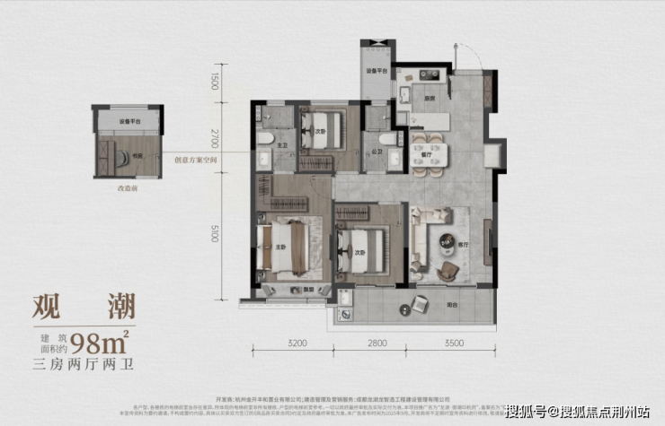 其中,建面约98㎡的三房两厅两卫户型,采用经典三开间朝南布局,双联阳台,主卧还有独立衣帽空间,没有错过一丝收纳环节,解决年轻家庭每到换季就要“断舍离”的烦恼,是真正对300万级刚需友好的起步户型。
