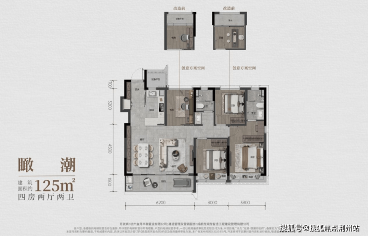 建面约125㎡的功能性四房户型,同样三开间朝南,餐客厅、阳台一体化的布局,增添了空间通透感,以低门槛满足改善家庭多房间、大客厅的居住需求。