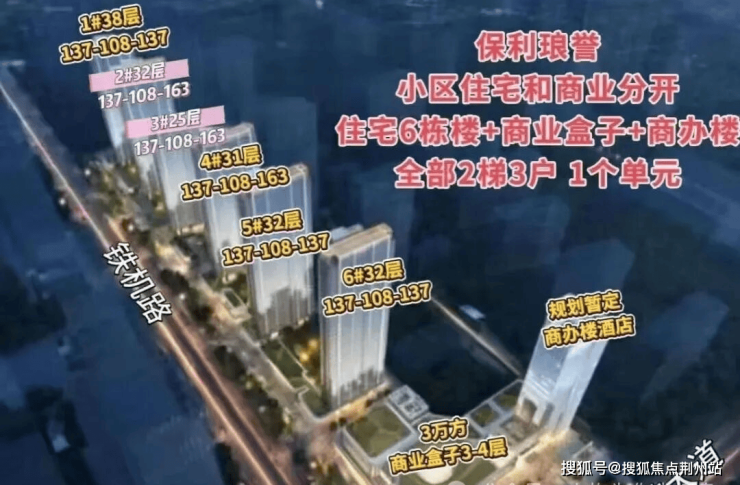 保利琅誉即保利城四期一共6栋房子分为AB两个区—-B区北片项目,共四栋住宅楼,其中1#38F,2#32F,3#25F,4#31F,2、3、4#都有架空层。保利琅誉一共360户,车位配比1:1.09。A区南片有2栋 住宅和商业5#32F和6#32F