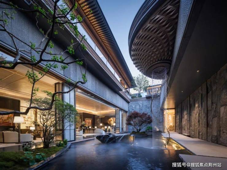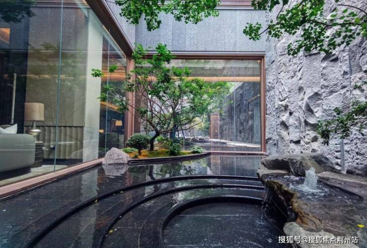 这是第一个下沉式庭院:当水光潋滟的龙鳞水钵通过水帘柱把水流引向下沉式庭院,它就变成了行政酒廊里的一幅山水图景。