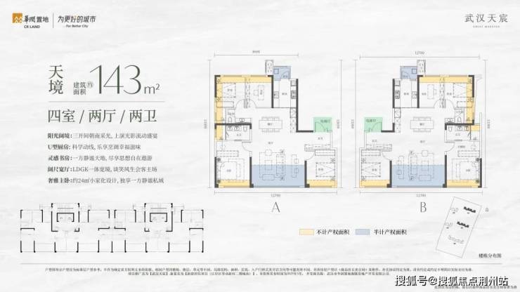 武汉天宸项由3栋29-33层的高层和2栋13-17层的小高层组成,还有1所幼儿园和少量临街商业组成。项目一共只有5栋楼,目前已全部推出,2、3、4、5号楼已基本售完,目前主推1号楼建面约143平带装修房源。