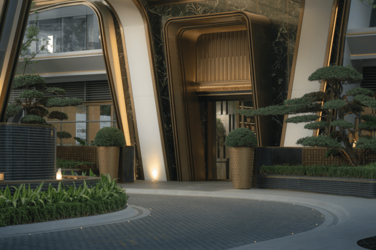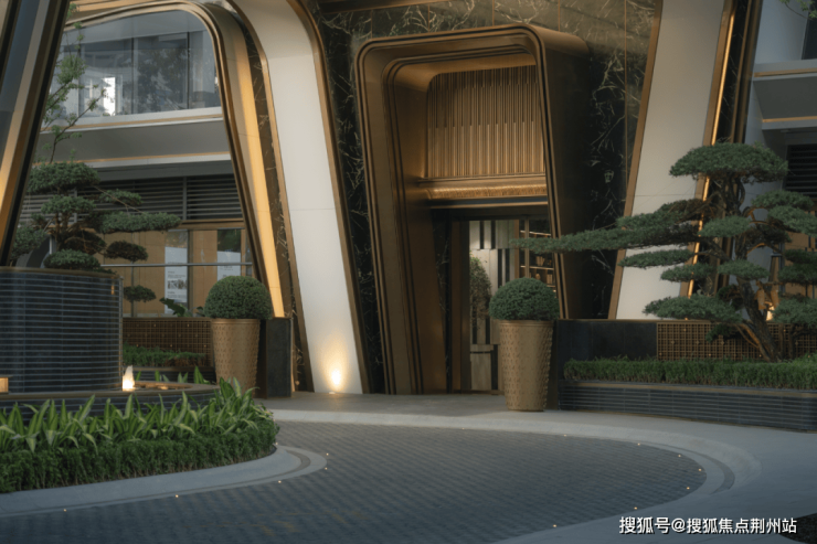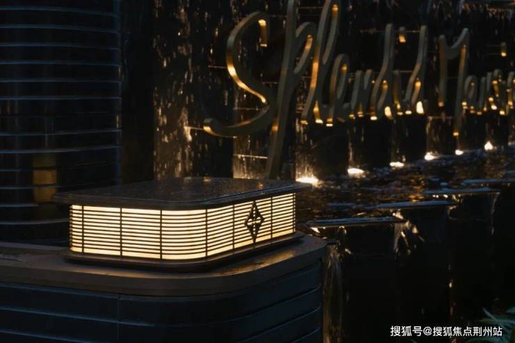 大堂入口处以区别于常规材料的深色奢石景墙与室内化的香槟金灯具,营造礼仪入口空间