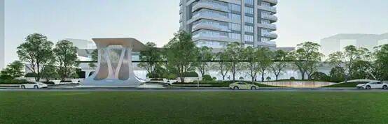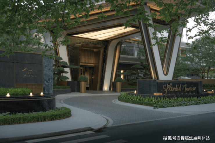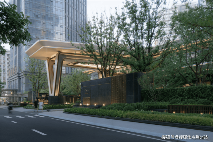 临街城市界面以精致化的景观水景并结合灯光凸显建筑V形结构的雕塑感,提升整体空间的艺术气质