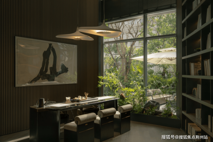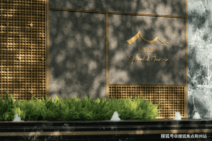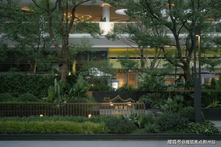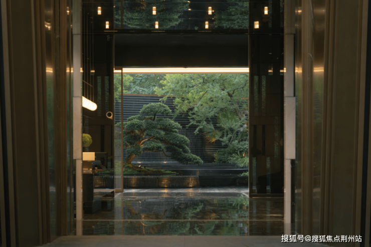 以属地纹样的金属格栅强化转角景墙,并点缀大尺度罗汉松和LOGO,赋予转角空间精神堡垒的属性