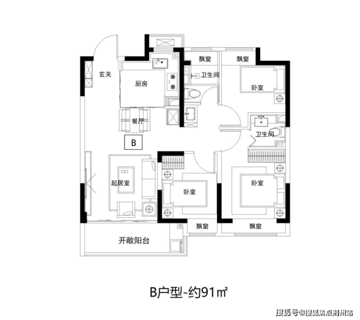 建面约91㎡3房2卫,三开间朝南,客餐厅连通大阳台,四飘窗设计,好户型该有的素质它都有。