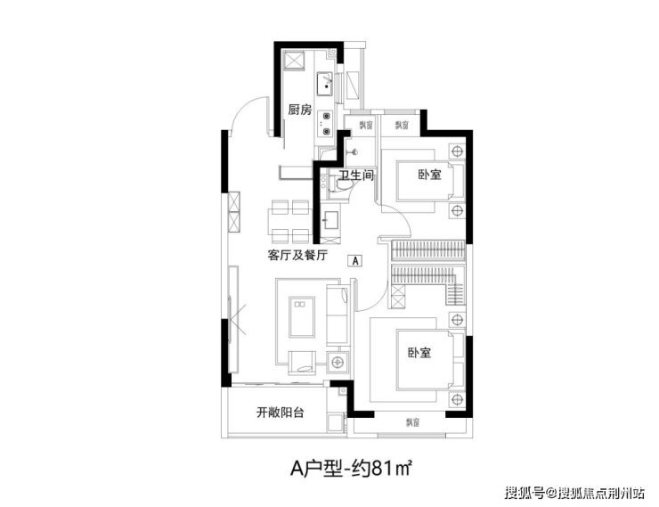 建面约81㎡2房功能齐全,拥有朝南大面宽和全卧飘窗设计。