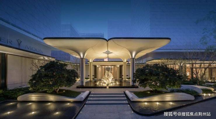 特选价值百万约200年树龄的日本茶梅;采用最长约13米的贝金米黄石材,整石切割的门头水景石材;标志性的芝兰玉树,从2:1到2.6:1进行比例迭新;架空层与街区圆融一体……