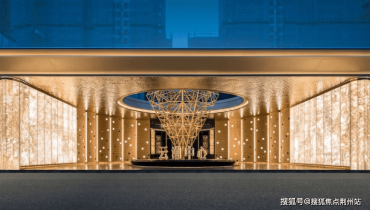 项目南侧主入口采用星级酒店式的“镂空穹顶+对称序列”设计,中央的“天水之钻”的金属造型与镜面水景作为主体,两侧的进口发光奢石营造具备温馨氛围的“半围合式空间”,城市道路的硬质感被社区门庭轻易削弱,居住者的归家仪式感油然而生。