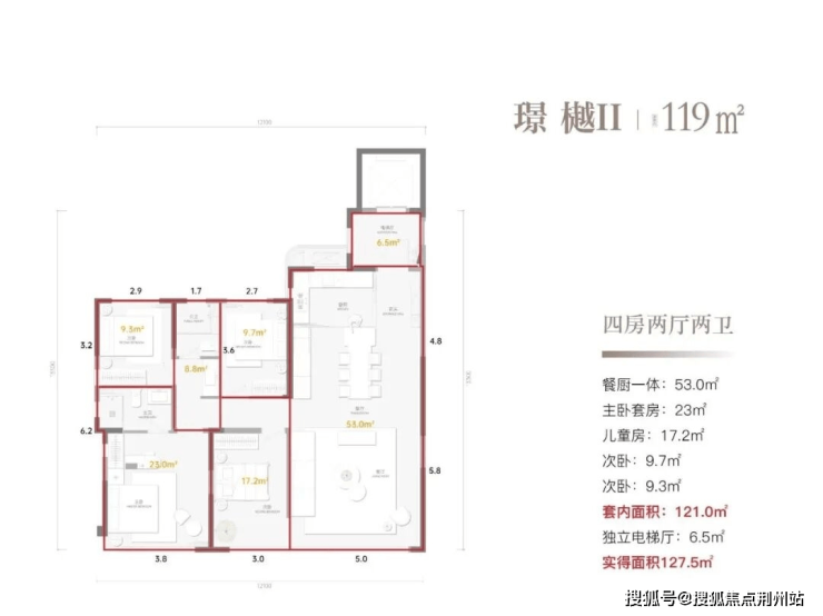 该户型位于 8 号楼的边户,实际的得房面积比较高,南北通透,可实现独立电梯入户,三开间朝南,户型也很方正,且这个面积做了四房功能性不错,不追求多卧室的话,把次卧改成大横厅或者融入主卧做成超大主卧套房也是不错的选择。