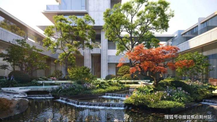 南下沉庭院,打造叠水景观,潺潺的水声打破庭院的宁静,却又增添了几分灵动,整个画面像徐徐展开的山水画↓
