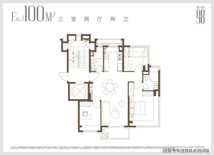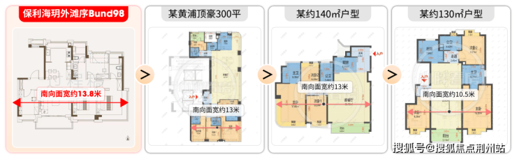 同面积段三开间户型面宽约10.5米,同面积四开间朝南户型面宽约13米,Bund98比他们更胜一筹。