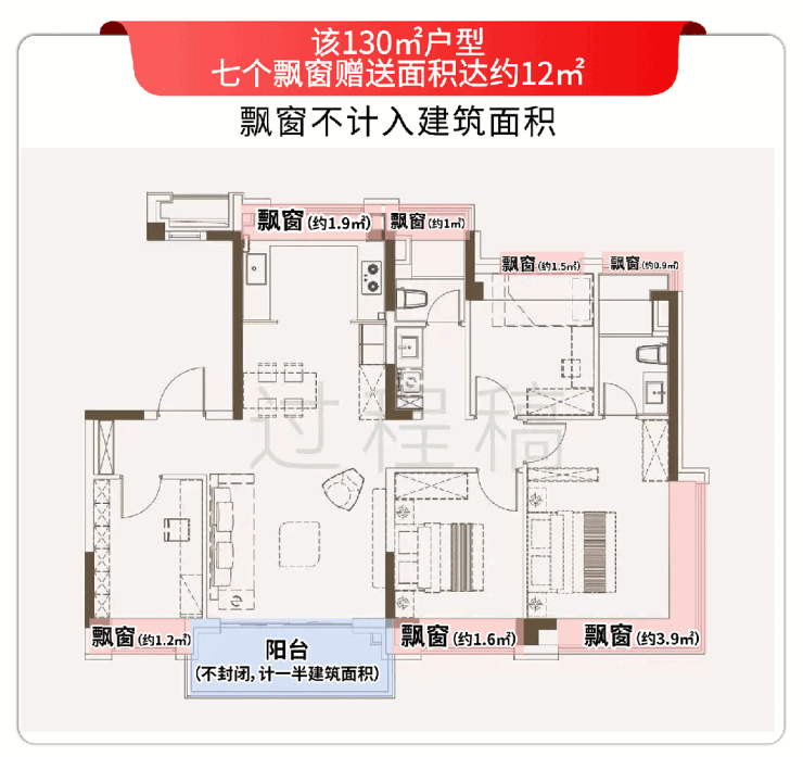 根据小胖看房建筑师测算,七个飘窗赠送面积达约12平,比常规次卧都大。