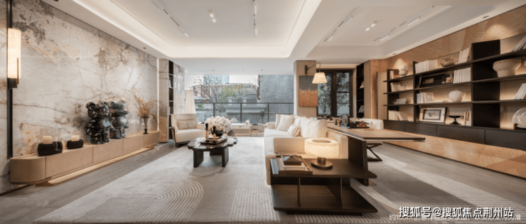 比如墙面使用大量温润木饰面铺陈,电视背景墙选用岩板,客厅地面铺设云朵拉灰石材、餐边柜台面镶嵌卡里冰玉大理石,将高级感渗透到生活的每个角落。