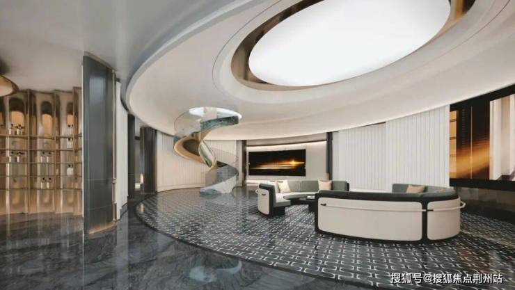 圆弧石材墙面,双曲面天花,中央水景吊灯之下,一座连通地下会所的旋转艺术楼梯成为空间的点睛之笔。