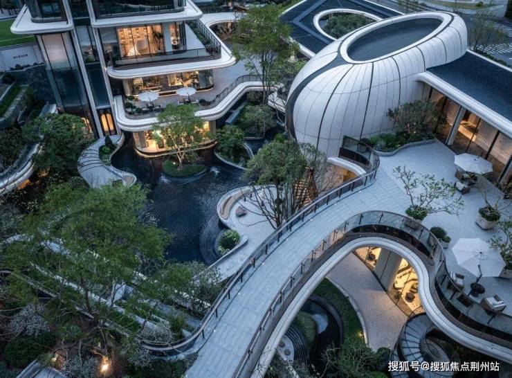 还有整体抬板设计,利用近17.5米的高差,打造了一座融合峡谷、密林、叠瀑的“立体山林”,引水入户,纳气聚财。