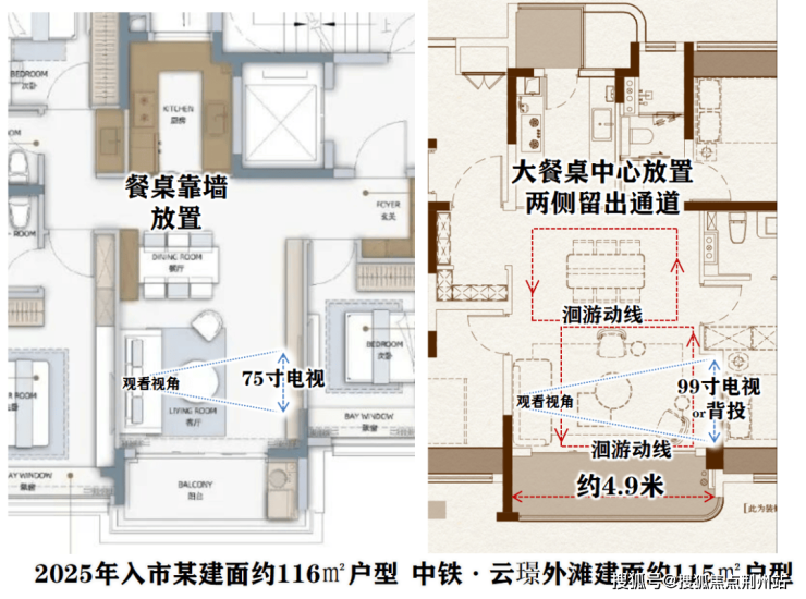 约4.9米是什么概念?同面积段三房,客厅面宽往往只有3.8-4.2米,放75寸电视刚好合适。