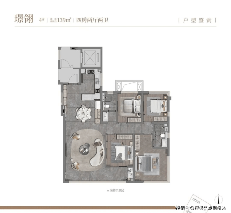 ②139平户型,四房两厅两卫:位于2、4号楼的端头边户,户型做到南北通透,且有三开间朝南的设计,整体结构相对常规。该户型配备独立电梯前室,并且电梯前室额外增设了一道门用于隔离。建面约139㎡的空间能规划出四房布局,功能性表现较强。值得一提的亮点是主卧带有全景舱两面拐角飘窗,不仅优化面积较多,采光效果也不错;不过受飘窗布局影响,卧室床的摆放会受限,大概率需要对着主卧门口放置。