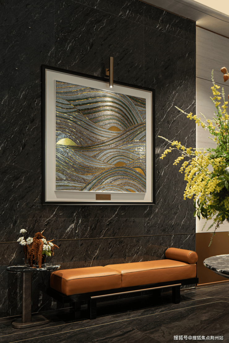 大堂背景墙上是名为《溯光流彩》的螺钿工艺画,用七彩流光的贝壳为材,勾勒水的灵动。居者能在水纹交织,水波荡漾中聆听宁静与生机对话,感受水的张扬与包容,更能在这熠熠光辉的流动中提升生命活力与精神能量。