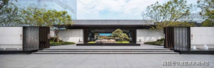 建筑门堂主体高宽比1:4,建筑与景墙横向延展,塑造绵延的城市画卷,融入奢华与精致的材质细节,勾勒出江南姑苏城独有的诗意东方风情。仿佛一幅流动的江南水墨,细腻而深邃,将苏州的精致与典雅完美融合,展现出江南的韵味。