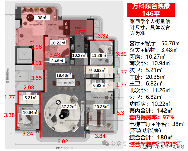 综合使用面积180㎡、套内144㎡,毛坯总价190万左右;我们拿万科东合映象的高层146平做对比,综合和套内面积几乎一样,带精装总价约210万、换算毛坯后总价也基本一致。