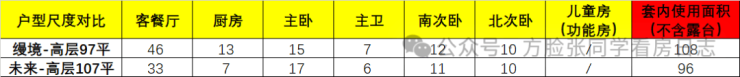 再看主要功能空间尺寸对比:我做了个直观的数据表格,可以发现,招商在厨房、次卧的尺度上更大,万科则强在客餐厅的尺度。