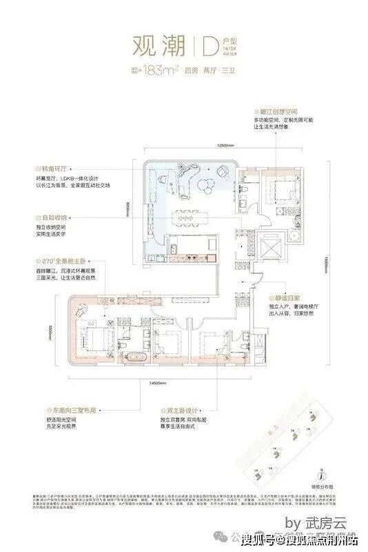 该户型三面采光,三开间朝南,带独立电梯前室,270度观江,设计非常有想象力。