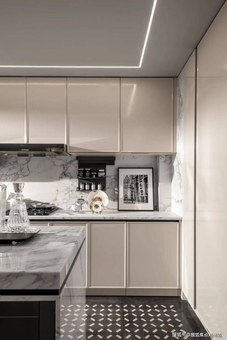 厨房也享有270度飘窗景观,充分引入自然光线;头顶有一圈环状灯带,把灯光温柔投射;统一配色烤漆板柜面又将光细腻反射,给人温润如玉之感。