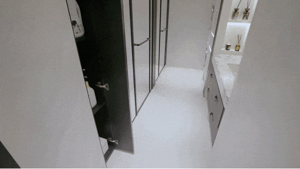 比如外滩瑞府让人惊叹的“巨兽级”收纳体系,其代表是整体采用模块化设计的厨房柜体,收纳空间展开就像“变形金刚”一样,可按压开柜、下拉式拉篮、随心抽、骑马抽、燕尾抽、取物镜……
