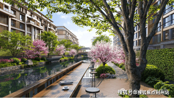 社区内部师法沧浪亭、可园等名园精髓,以"一轴一环两园十六景"的布局,打造移步换景的立体园林。五百年的油橄榄、五针松、复刻留园的"古木交柯"的连理枝等全冠名木遍布园中。