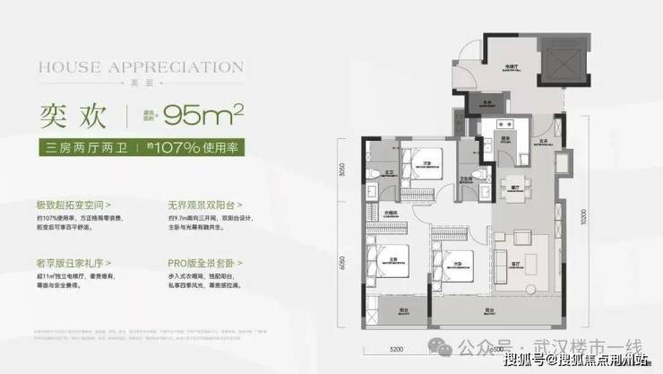建面约95㎡三房两厅两卫,中间户但有独立电梯厅,U型厨房看着很大,整体南向面宽约9.7米,整体有约107%使用率(含电梯前室),相当于人家120平的空间利用率了。