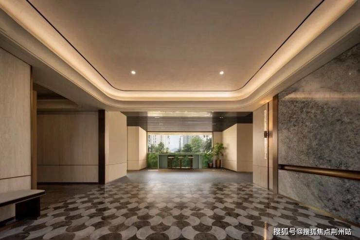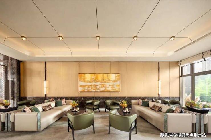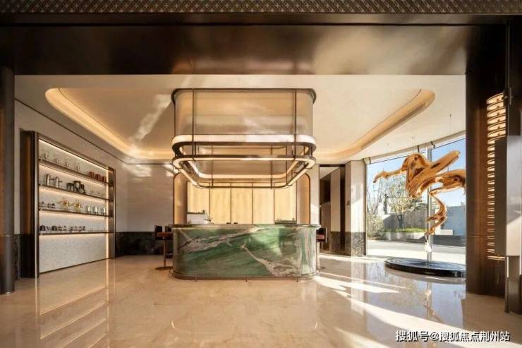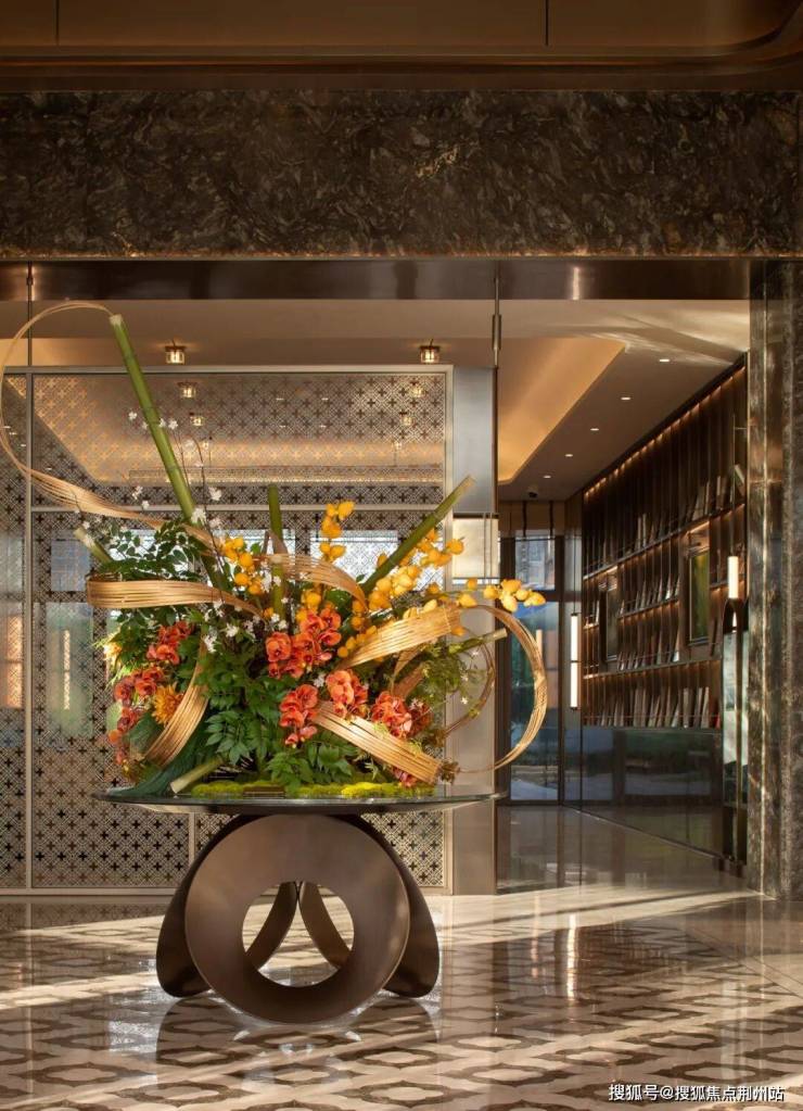 镂空的金属纹理,翠绿色大理石纹,为空间增添层次感。大型花艺作品《嘉禾》,以黄金果、竹子、蝴蝶兰为花材,展现草长莺飞的春日景象,赋予项目庭盈福瑞的美好寓意。