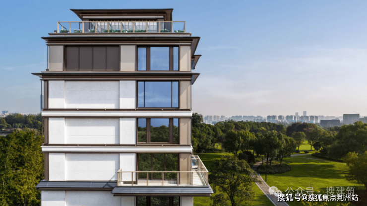 叠墅五层与六层转角处,皆做飞檐形态,轻盈中带有庄重;顶部飞檐及中部飞檐演绎曲檐翼角;飞檐底部以铜色铝板多层叠退,演绎宋式斗拱的支撑意象,既传承古制,又极尽现代工艺之精巧。